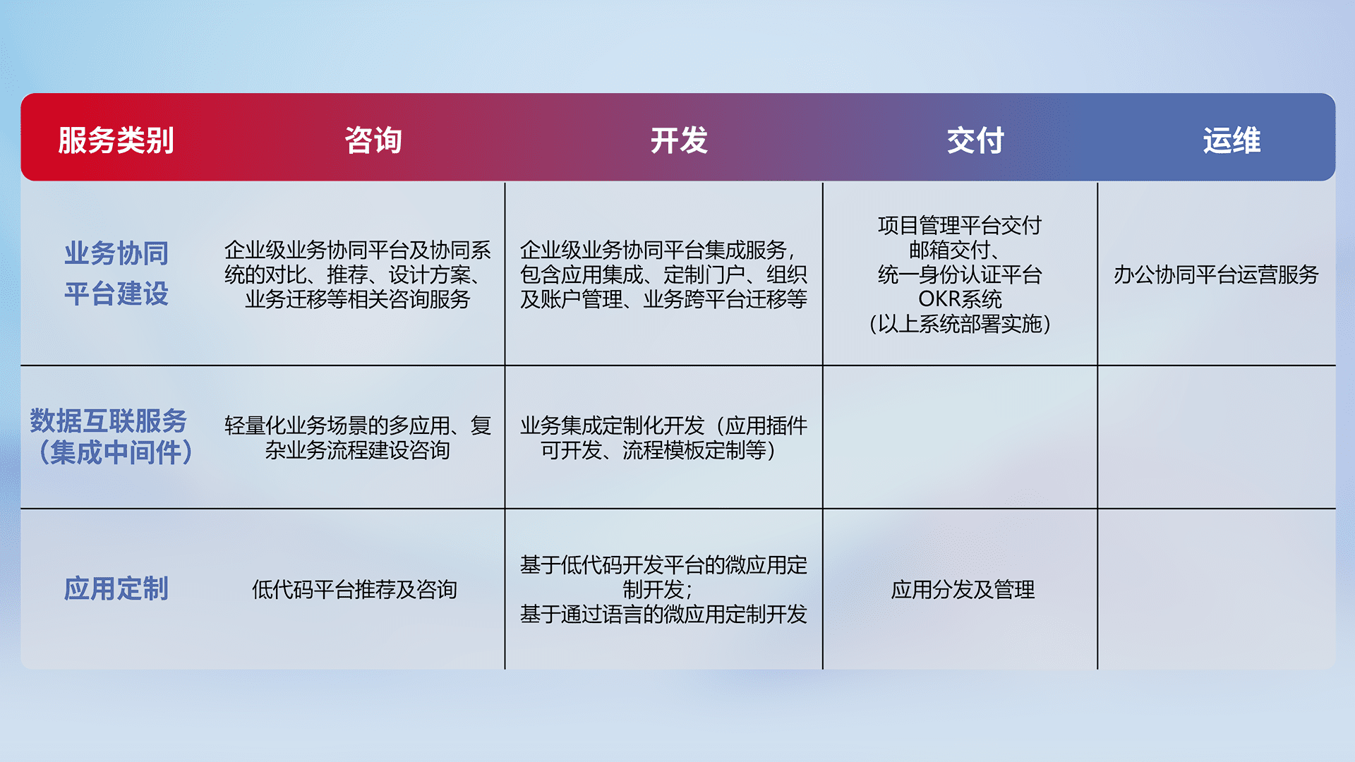 针对钉钉、、、、企微、、、IDaas等平台级产品提供产品的规划、、、方案、、、、交付、、、、定制化开发等服务,,实现如统一协同办公、、智能客户服务、、混合会议管理、、、智能数据查询、、、、等业务场景,,,实现数字化转型。。。。